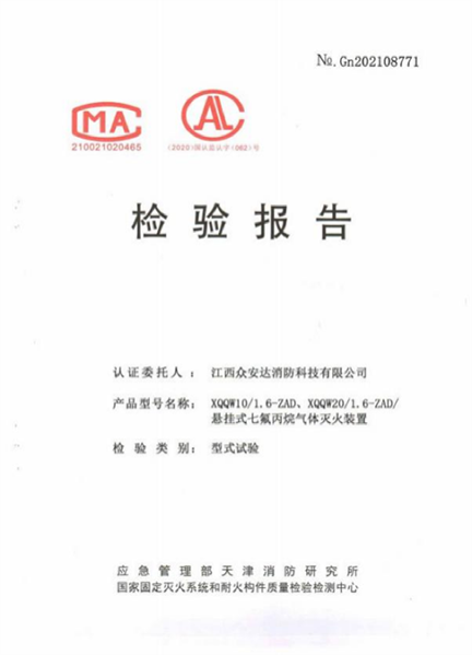 悬挂式七氟丙烷认证证书