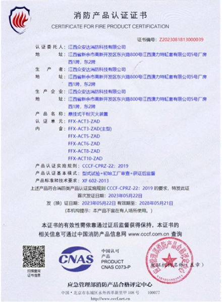 悬挂式超细干粉灭火装置